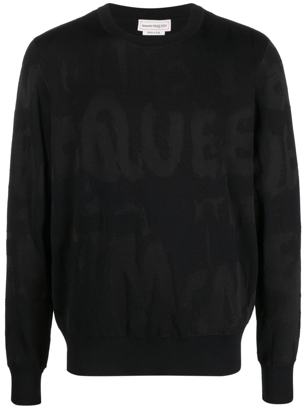 intarsia-knit logo sweater Spun from a delicate wool blend, this sweater from Alexander McQueen speaks to the brand's penchant for a branded touch. Cut for a slightly oversized silhouette, it features a tonal jacquard-knit logo all over. Highlights - Black - Wool blend - All-over logo print - Crew neck - Long sleeves - Ribbed cuffs - Ribbed hem Made in Italy Composition Viscose 100%, Polyamide 100%, Cotton 100% SIZE & FIT Model measurements Height 6 ft 2 in(1.87 m) Bust/Chest 35.82 in(91 cm) Hips 35.43 in(90 cm) Waist 27.95 in(71 cm) FittingInformation This piece fits true to size. We recommend you get your regular size Cut for a relaxed fit Made with a mid-weight stretch fabric Washing instructions Dry Clean Only