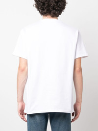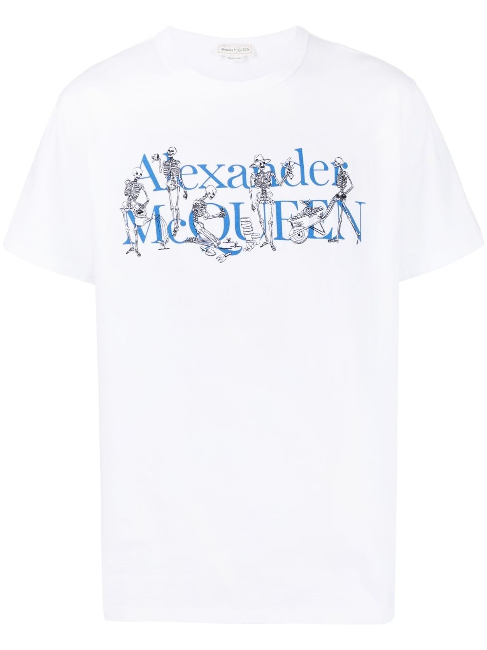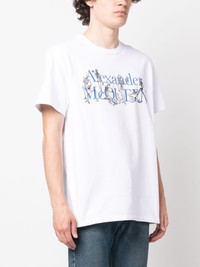 logo-print short-sleeve T-shirt Effortlessly tying in with current branding trends, this short-sleeve T-shirt from Alexander McQueen features the brand's logo printed across the front of the design, alongside a graphic print which highlights the brand's gothic influences. Highlights - White - Cotton - Logo print to the front - Round neck - Short sleeves Made in Italy Composition Cotton 100%, Viscose 75%, Polyester 25% SIZE & FIT Model measurements Height 6 ft 1 in(1.86 m) Bust/Chest 34.64 in(88 cm) Hips 35.43 in(90 cm) Waist 27.55 in(70 cm) FittingInformation Designed to be unstructured, offering a loose fit throughout Made from a midweight non-stretch fabric, this piece offers minimal elasticity when worn This piece fits true to size – take your usual size