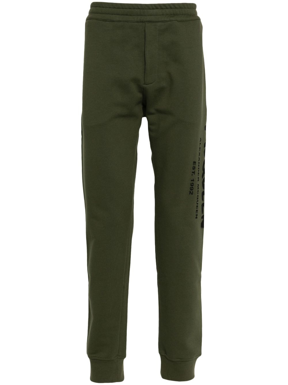 logo-print track pants Alexander McQueen takes inspiration from athletic silhouettes and presents this green pair of track trousers from the SS22 collection and receive a modern edge with a tapered leg. Highlights - Army green - Cotton - Jersey texture - Elasticated waistband with internal drawstring - Two side inset pockets - Rear zip-fastening pocket - Tapered leg - Front zip fastening Made in Italy Composition Lining: Cotton 100% Outer: Cotton 100% SIZE & FIT Model measurements Height 6 ft 2 in(1.88 m) Bust/Chest 36.61 in(93 cm) Hips 35.82 in(91 cm) Waist 27.95 in(71 cm) FittingInformation Designed for a slim tapered leg, offering a close fit that sits just away from the leg with a closer fit towards the ankle Adjust this piece’s waistband to your preference using the drawstring Made from a midweight non-stretch fabric, this piece offers minimal elasticity when worn This piece fits true to size – take your usual size Washing instructions Machine Wash