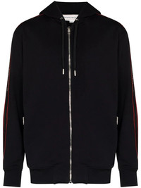 logo-tape zip-up hoodie Alexander McQueen offers casual style with this hoodie. Detailed with logo-tape embellishment, the piece is crafted to a relaxed, hooded silhouette for laid-back appeal. Imported Composition Cotton 100%, Polyester 100% SIZE & FIT Model measurements Height 6 ft 2 in(1.87 m) Bust/Chest 38.18 in(97 cm) Hips 36.61 in(93 cm) Waist 29.13 in(74 cm) FittingInformation This piece fits true to size. We recommend you get your regular size Cut for a relaxed fit Made with a mid-weight fabric