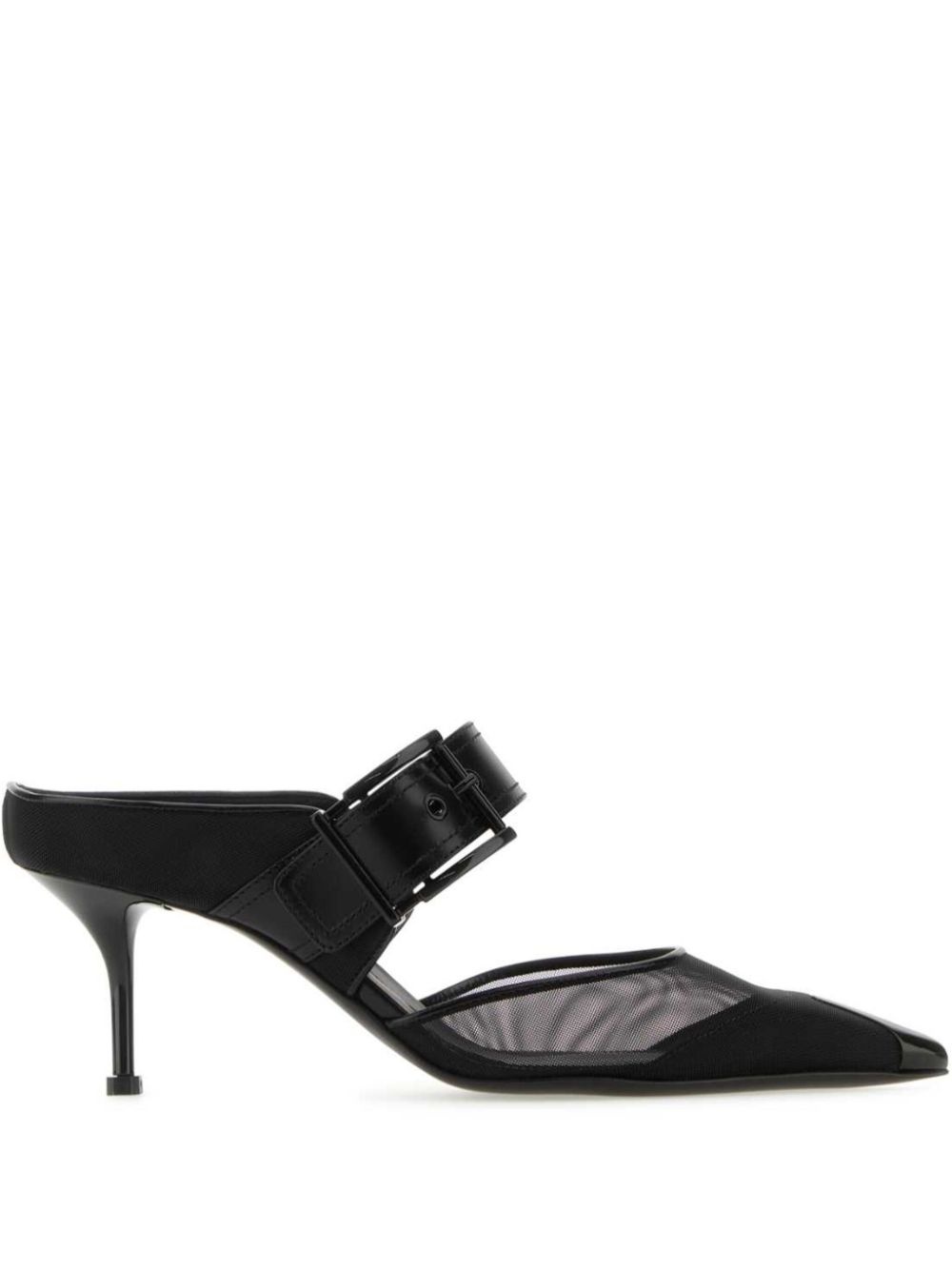 65mm Punk buckled mesh mules Highlights - Black - Mesh panelling - Pointed toe - Open back - Buckle fastening - Branded footbed - Mid heel Made in Italy Composition Outer: Leather 100%, Nylon 100% Sole: Leather 100% SIZE & FIT Measurement HEEL 2.55 in(6.5 cm)