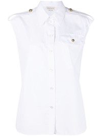 Military-pocket sleeveless shirt Alexander McQueen explores utilitarian codes for its AW23 collection, as showcased by this sleeveless shirt. The white-hued garment is characterised by a military-inspired patch pocket on the front and is finished with gold-tone Seal logo buttons. Highlights - Optical white - Organic cotton - Gold-tone hardware - Straight-point collar - Front button fastening - Epaulettes - Sleeveless - Chest flap pocket - Straight hem Made in Italy Composition Outer: Organic Cotton 100% Lining: Organic Cotton 100% SIZE & FIT Model measurements Height 5 ft 11 in(1.8 m) Bust/Chest 34.25 in(87 cm) Hips 35.82 in(91 cm) Waist 24.8 in(63 cm) FittingInformation Designed to be unstructured, offering a loose fit throughout Made from a lightweight non-stretch fabric This piece fits true to size – take your usual size