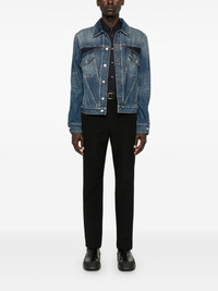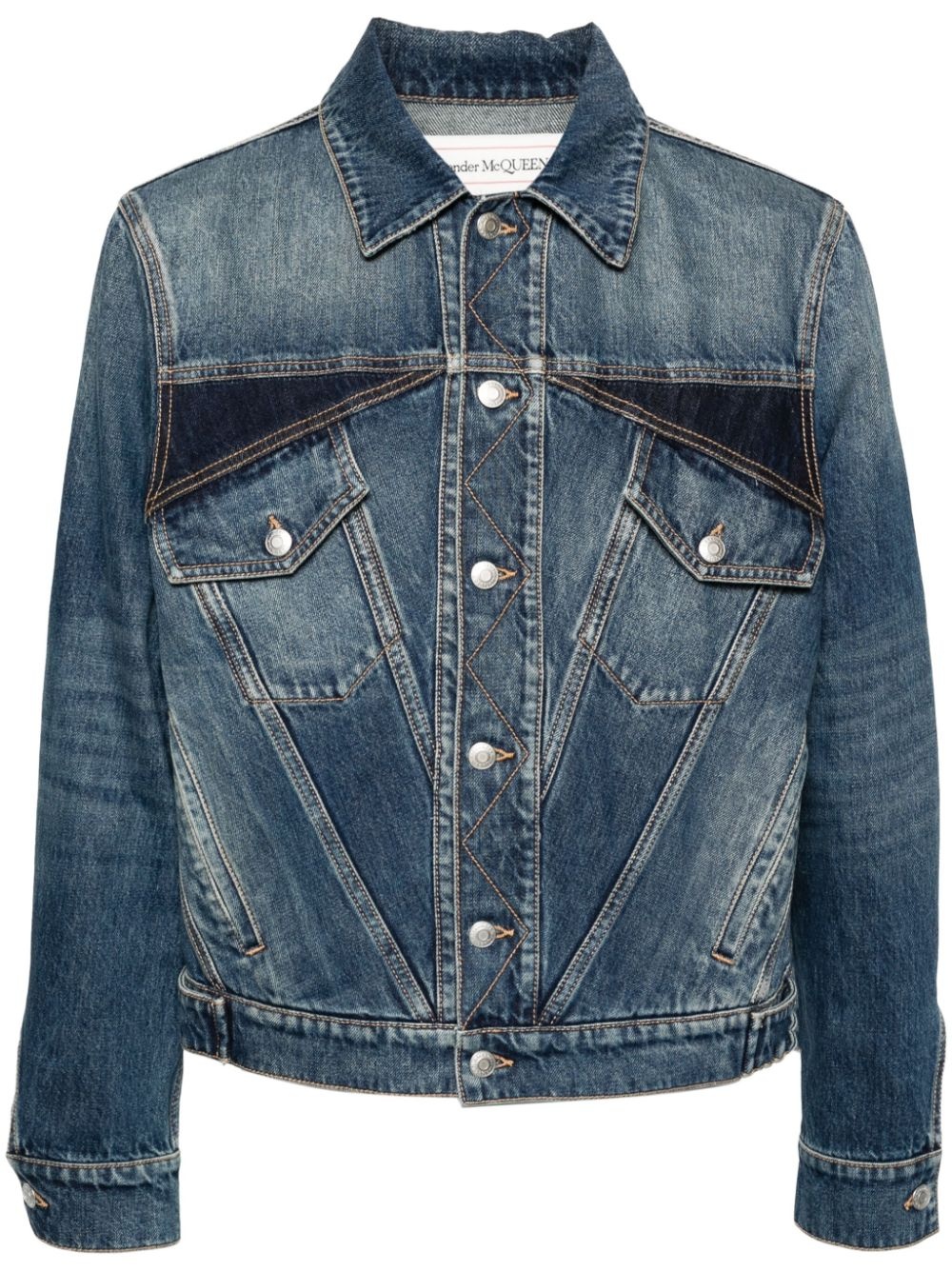 panelled denim jacket Highlights - Indigo blue/navy blue - Cotton - Washed denim - Contrast stitching - Panelled design - Spread collar - Long sleeves with buttoned cuffs - Two chest button-fastening flap pockets - Two side diagonal welt pockets - Waist tabs - Straight hem - Front button fastening Made in Italy Composition Lining: Polyester 65%, Cotton 35% Outer: Cotton 100% SIZE & FIT Model measurements Height 6 ft 2 in(1.87 m) Bust/Chest 36.41 in(92.5 cm) Hips 37 in(94 cm) Waist 29.52 in(75 cm) FittingInformation Designed for a regular fit, allowing for a comfortably loose fit throughout the body Sturdy and hard-wearing, this denim piece offers no stretch This piece fits true to size – take your usual size Washing instructions Machine Wash