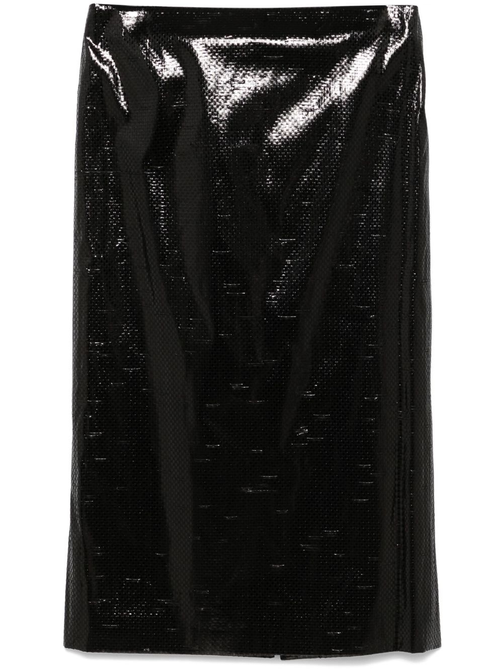 tarpaulin pencil midi skirt Highlights - Black - Silk blend - Tarpaulin weave - Interwoven design - Glossy finish - Concealed rear hook and zip fastening - Low-rise - Dart detailing - Rear slit - Full lining - Straight hem - Mid-length Made In Italy Composition Silk 86%, Polyamide 14% Lining: Acetate 74%, Silk 26% SIZE & FIT Model measurements Height 5 ft 11 in(1.8 m) Bust/Chest 35.03 in(89 cm) Hips 35.03 in(89 cm) Waist 23.62 in(60 cm) Measurement HIPS 32.99 in(83.8 cm) LENGTH 29.48 in(74.9 cm) WAIST 29.01 in(73.7 cm)
