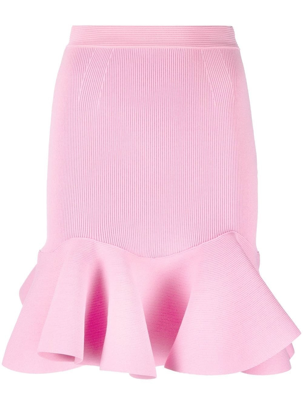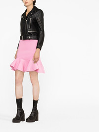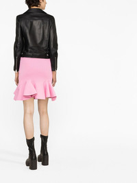 peplum-hem knitted skirt This miniskirt from Alexander McQueen's SS23 collection is presented in a bubblegum pink hue. It boasts purposeful detailing, such as the finely ribbed construction and playful peplum hem that adds a charming volume to the silhouette. Highlights - Bubblegum pink - Fine ribbed - Peplum hem - Thigh-length Made in Italy Composition Viscose 73%, Polyester 15%, Polyamide 11%, Spandex/Elastane 1% SIZE & FIT Model measurements Height 5 ft 10 in(1.78 m) Bust/Chest 30.7 in(78 cm) Hips 34.64 in(88 cm) Waist 23.22 in(59 cm) FittingInformation This piece fits true to size. We recommend you get your regular size Designed to be fitted at the waist and hips, loose over the leg Made with a mid-weight stretch fabric Measurement HIPS 25 in(63.5 cm) LENGTH 20.51 in(52.1 cm) WAIST 22 in(55.9 cm) Washing instructions Dry Clean Only