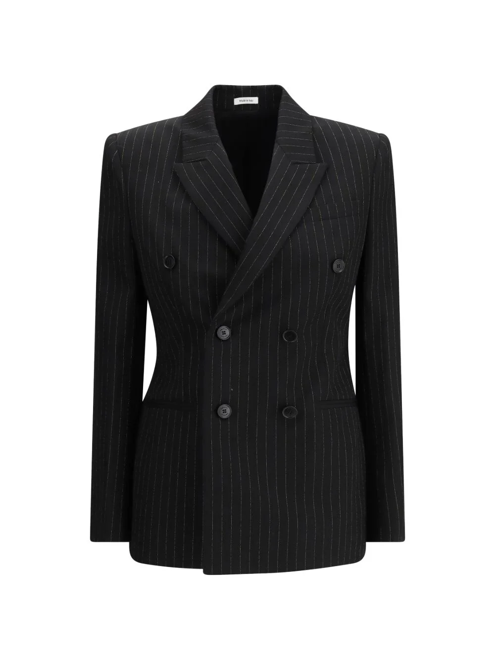 pinstripe-print double-breasted blazer Highlights - Black - Pinstripe print - Double-breasted button fastening - Peaked lapels - Buttoned cuffs Made in Italy Composition Wool 100% Washing instructions Dry Clean Only
