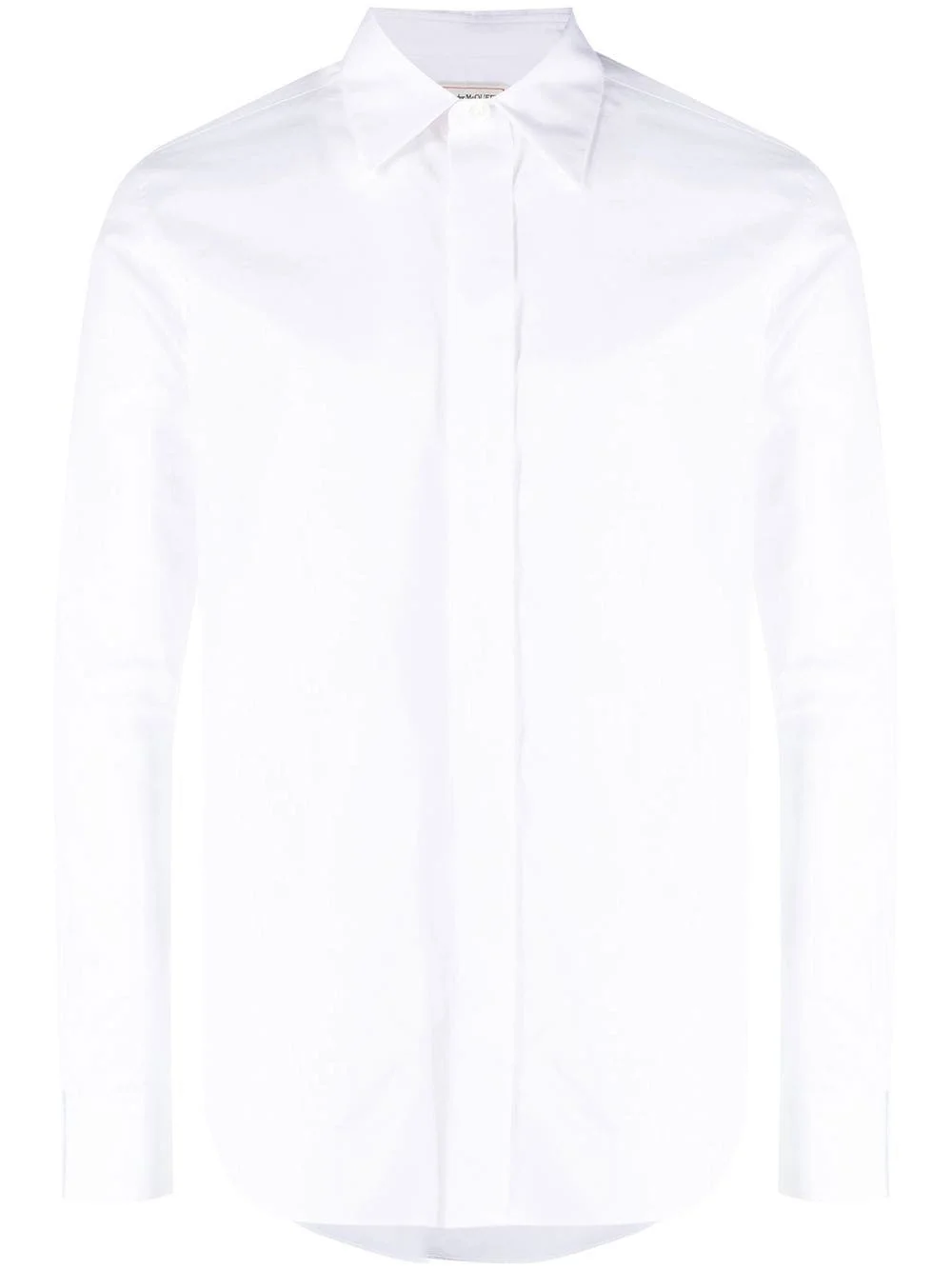 pointed-collar poplin shirt Alexander McQueen honours the classic white shirt. Made from traditional cotton-poplin, this understated iteration is free from decoration and fastens with a concealed front button fastening. Imported Composition Cotton 100% SIZE & FIT Model measurements Height 6 ft 2 in(1.87 m) Bust/Chest 35.82 in(91 cm) Hips 35.43 in(90 cm) Waist 27.95 in(71 cm) FittingInformation This piece fits true to size. We recommend you get your regular size Cut for a loose fit Made with a mid-weight non-stretch fabric Washing instructions Dry Clean Only
