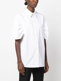 puff-sleeve cotton shirt Alexander McQueen plays with proportions in this crisp white shirt. Crafted in Italy from cotton poplin, it boasts a boxy silhouette and sleek straight-point collar, while its voluminous sleeves lend the garment softness and volume. Highlights - Optical white - Cotton - Poplin texture - Straight-point collar - Short puff sleeves - Front button placket - Curved hem Made in Italy Composition Cotton 100% SIZE & FIT Model measurements Height 5 ft 10 in(1.78 m) Bust/Chest 31.49 in(80 cm) Hips 37 in(94 cm) Waist 23.62 in(60 cm) FittingInformation Designed to be unstructured, offering a loose fit throughout Made from a midweight non-stretch fabric This piece fits true to size – take your usual size Washing instructions Dry Clean Only