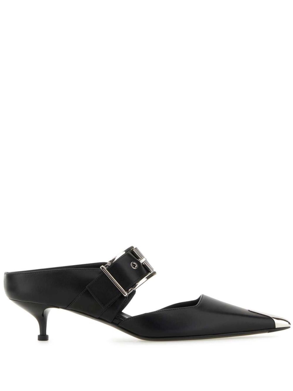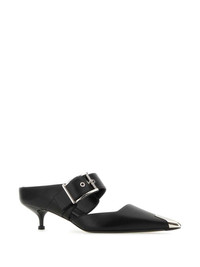 Punk Buckle 40mm leather mules These Alexander McQueen mules are characterised by a pointed-toe silhouette detailed with a silver-finished punk toe cap. The style is finished with an adjustable buckled strap and a lacquered stiletto heel. Highlights - Black - Calf leather - Silver-tone hardware - Metal toecap - Pointed toe - Buckle fastening - Slip-on style - Kitten heel Made in Italy Composition Lining: Calf Leather 100% Outer: Calf Leather 100% Sole: Leather 100% SIZE & FIT Measurement HEEL 1.57 in(4 cm)