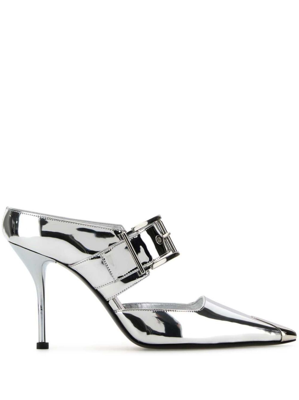 Punk 90mm buckled metallic mules Highlights - Silver-tone - Calf leather - Metallic finish - Decorative buckle detail - Slip-on style - Pointed toe - High stiletto heel - Branded insole Made in Italy Composition Sole: Leather 100% Lining: Leather 100% Outer: Leather 100% SIZE & FIT Measurement HEEL 3.54 in(9 cm)