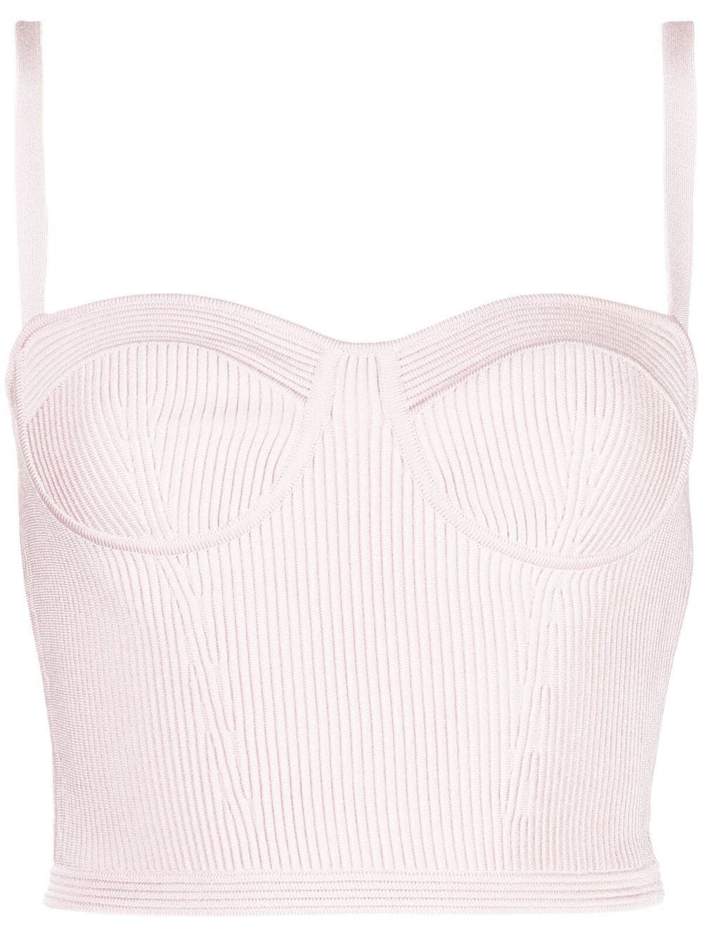 rib-knitted bustier crop top powder pink ribbed knit bustier-style neckline sleeveless thin shoulder straps concealed side zip fastening straight hem cropped unlined Made in Italy Composition Viscose 83%, Polyester 17% SIZE & FIT Model measurements Height 5 ft 9 in(1.76 m) Bust/Chest 29.13 in(74 cm) Hips 33.07 in(84 cm) Waist 22.83 in(58 cm) FittingInformation This piece fits true to size. We recommend you get your regular size Cut for a close fit Made with a mid-weight fabric