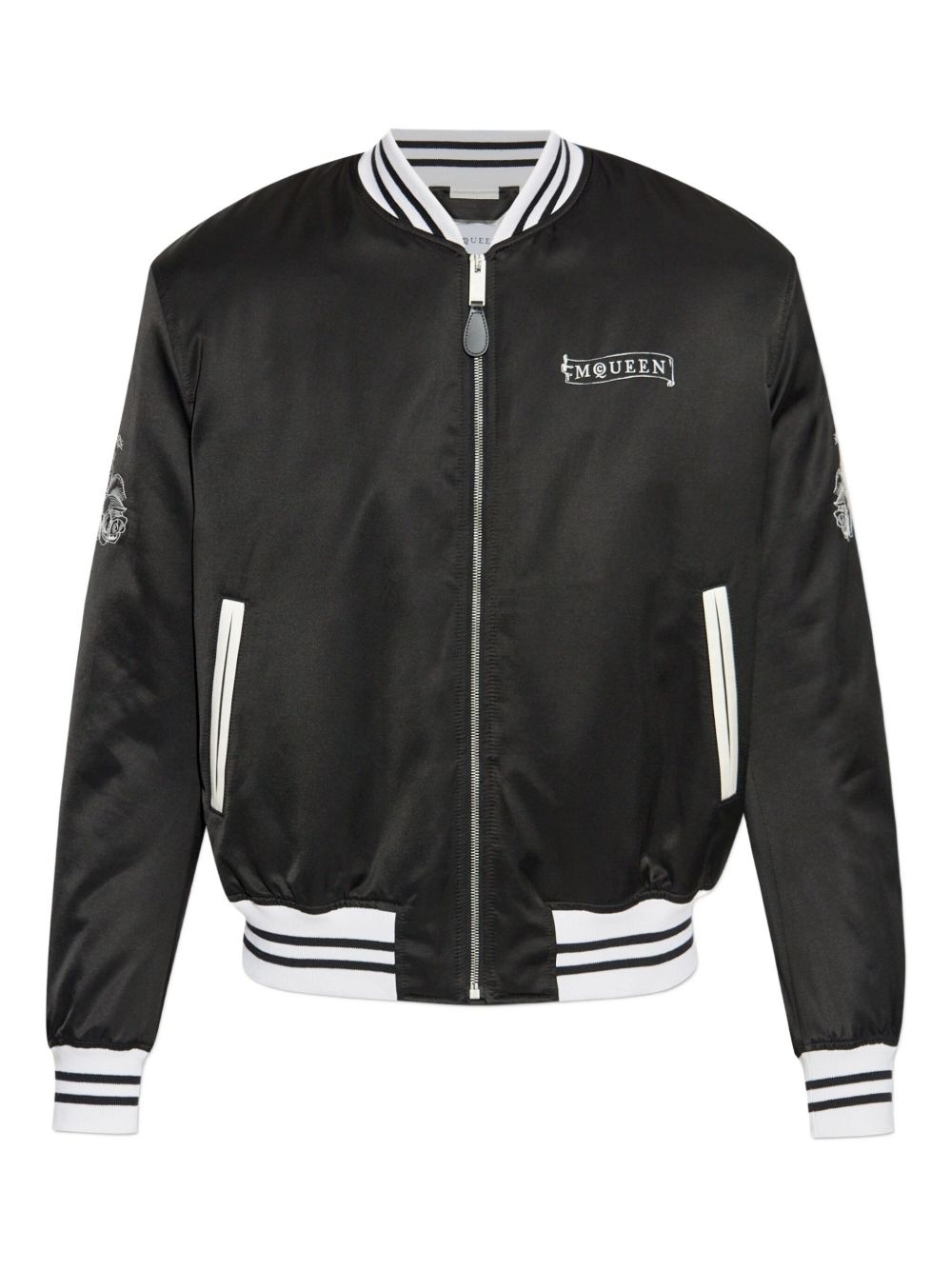 rose-embroidery satin bomber jacket Highlights - Black - Satin finish - Rose embroidery - Ribbed trims - Zip fastening Made in Italy Composition Outer: Cotton 50%, Viscose 50% Lining: Viscose 100% Washing instructions Read Manufacturer Guidelines