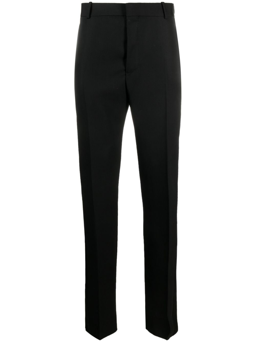 satin-trimmed tailored trousers Spun from wool, these trousers speak to Alexander McQueen's preference for tailoring with a twist. Trimmed with satin silk, the pair boasts a skinny fit along the leg. Highlights - Black - Wool - Skinny cut - Satin trim - Mid-rise - Belt loops - Concealed front fastening - Two side slit pockets - Two rear button-fastening jetted pockets Made in Italy Composition Outer: Wool 100%, Silk 100% Lining: Cupro 100%, Cotton 100% SIZE & FIT Model measurements Height 6 ft 2 in(1.87 m) Bust/Chest 36.41 in(92.5 cm) Hips 37 in(94 cm) Waist 29.52 in(75 cm) FittingInformation Designed for a slim fit, offering a comfortable fit that sits just away from the leg The unfinished hems allow for the length to be altered Made from a midweight non-stretch fabric This piece fits true to size – take your usual size