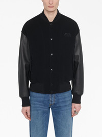 Seal-applique bomber jacket Alexander McQueen puts its signature stamp on this classic bomber jacket with a half Seal applique at the back – the new emblem incorporates the founders’ initials amongst the dissected petals of a Tudor rose. It’s cut with a felted body and leather sleeves in keeping with the design’s aviation roots. Highlights - Black - Calf leather - Panelled design - Logo patch to the rear - Embroidered logo at the chest - Rounded collar - Front press-stud fastening - Two side flap pockets - Long sleeves - Ribbed cuffs and hem Made in Italy Composition Calf Leather 100%, Wool 90%, Viscose 80%, Polyester 20%, Cashmere 10% Washing instructions Specialist Cleaning