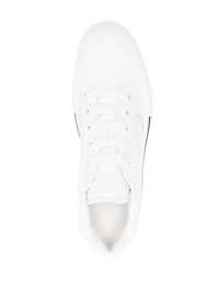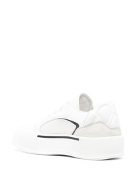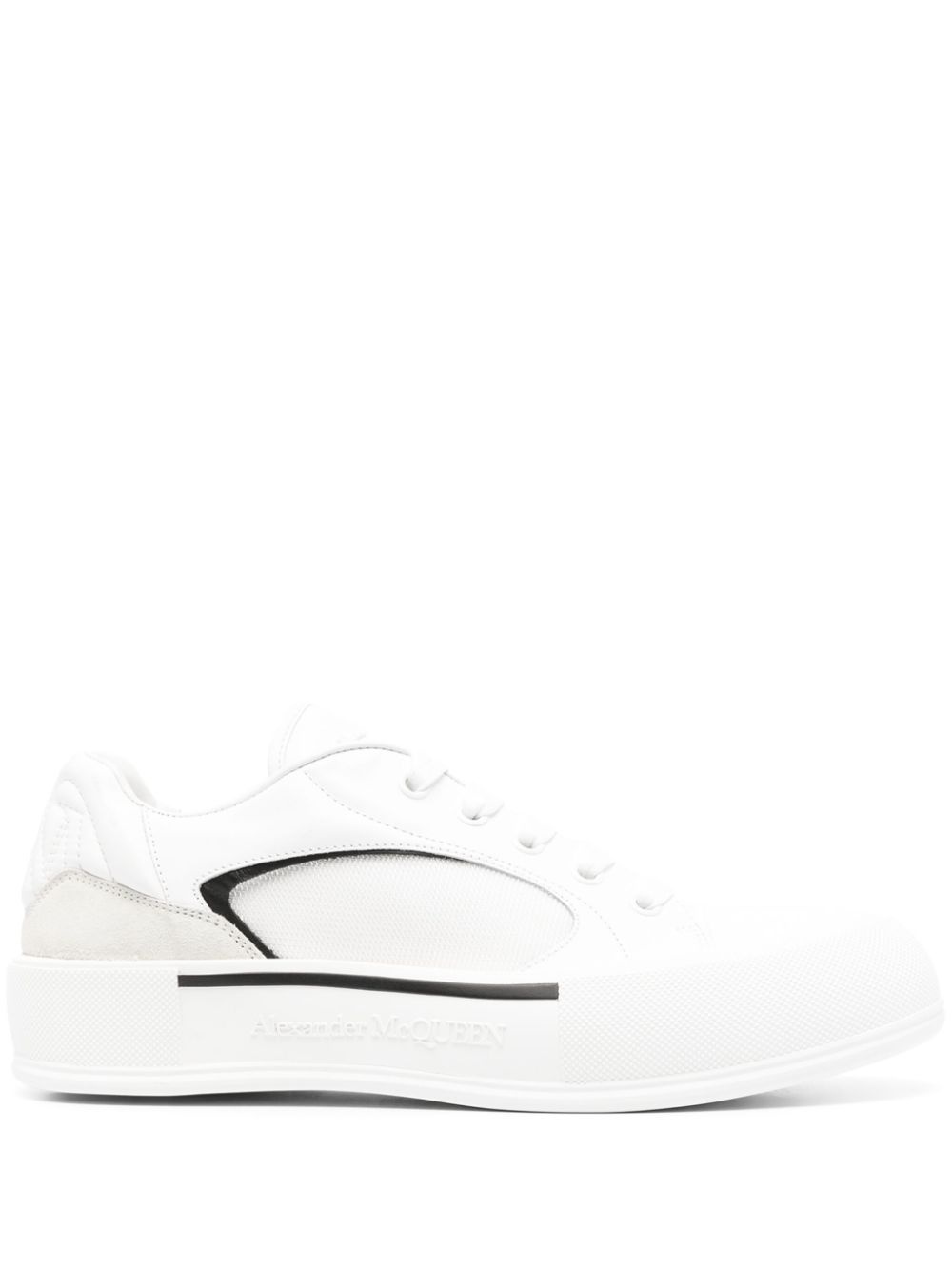 Skate Deck Plimsoll leather sneakers Crafted from white and black canvas, nappa leather and suede panels, Alexander McQueen's sneakers are set atop an oversized rubber sole, while the signature exploded Seal Logo details the heel counter. Highlights - White/black - Nappa leather - Panelled design - Suede panelling - Logo-embossed tongue - Embossed logo to the side - Seal-embroidered heel counter - Round toe - Front lace-up fastening - Leather lining - Padded ankle - Branded leather insole - Chunky rubber sole Made in Italy Composition Outer: Canvas 100%, Nappa Leather 100%, Suede 100% Sole: Rubber 100% Lining: Leather 100% SIZE & FIT Measurement PLATFORM 1.57 in(4 cm)