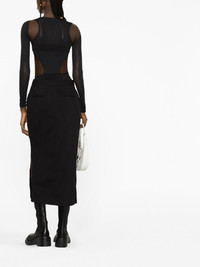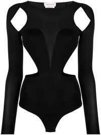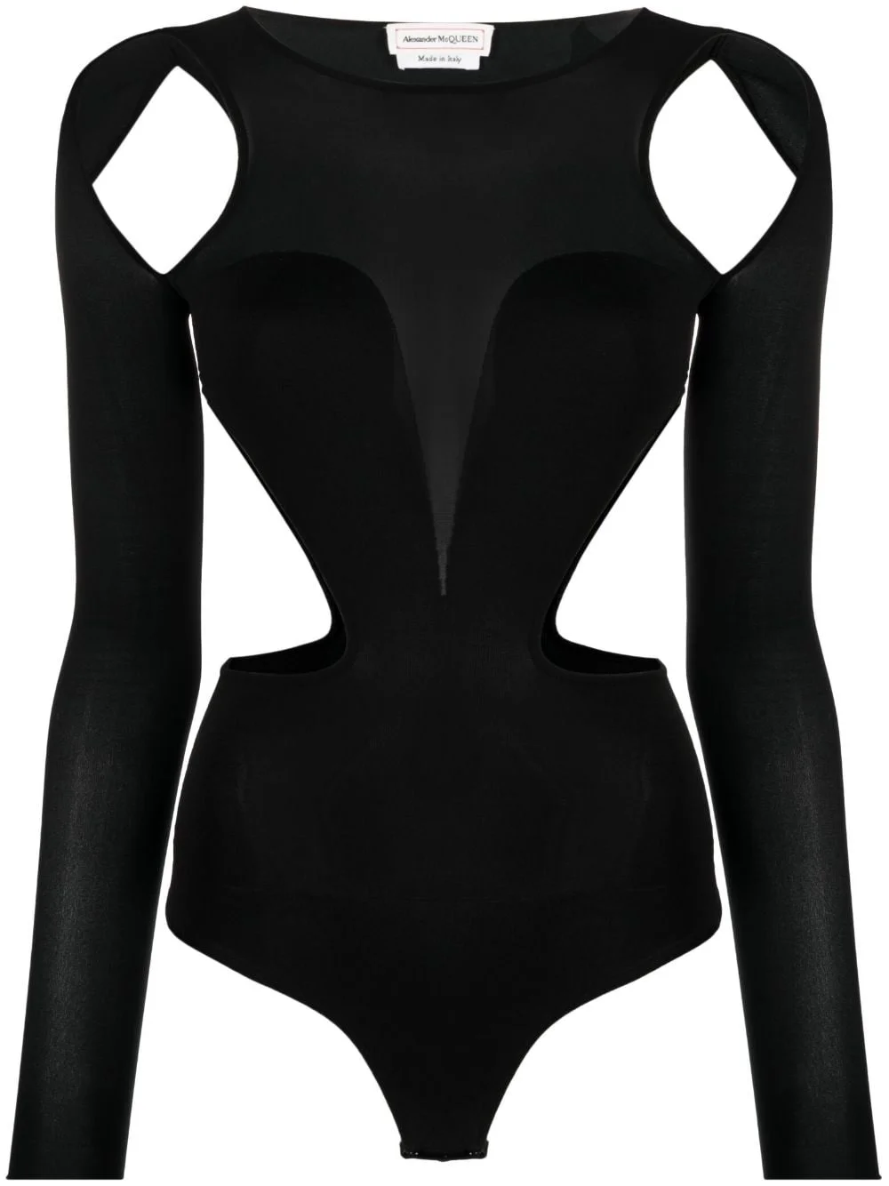 Slashed Corset cut-out bodysuit This Slashed Corset bodysuit speaks to Alexander McQueen’s punk-inspired aesthetic. The cut-out silhouette is elevated with sheer panelling that contributes to the bold appeal. Highlights - Black - Stretch-jersey - Sheer panels - Cut-out detailing - Corset style - Round neck - Press-stud fastening - Long sleeves - Just a reminder that this piece must be tried on over your own garments. Made in Italy Composition Silk 66%, Polyamide 26%, Elastane 8%