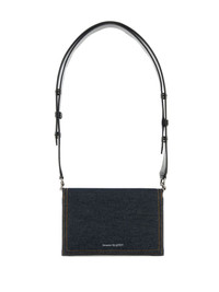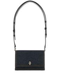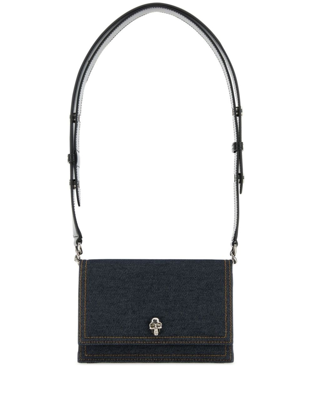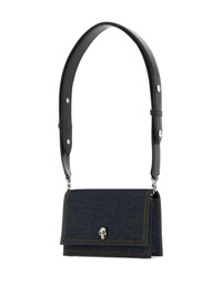 small Skull denim shoulder bag This small Skull bag from Alexander McQueen is subtly detailed with the brand's iconic Skull motif. Crafted from dark denim, it boats contrasting orange stitching for extra charm. Highlights - Black/blue - Denim - Skull applique - Silver-tone logo lettering - Adjustable shoulder strap - Foldover top with magnetic fastening - Main compartment - Internal slip pocket - Silver-tone hardware Made in Italy Composition Outer: Calf Leather 100%, Denim 100% SIZE & FIT Measurement DEPTH 1.96 in(5 cm) HEIGHT 4.72 in(12 cm) STRAP 30.7 in(78 cm) WIDTH 7.48 in(19 cm)