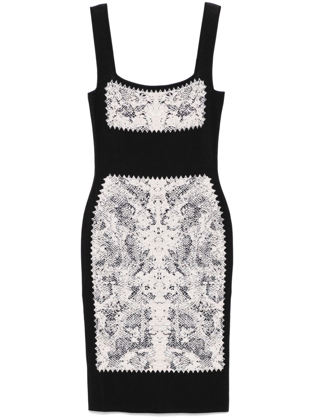 snake print knit dress Highlights - Black - Full jacquard - Square neck - Wide shoulder straps Made in Italy Composition Viscose 88%, Polyester 12% SIZE & FIT Model measurements Height 5 ft 10 in(1.78 m) Bust/Chest 33.46 in(85 cm) Hips 36.22 in(92 cm) Waist 23.22 in(59 cm) FittingInformation Designed for a close fit throughout Made from a midweight non-stretch fabric, this piece offers minimal elasticity when worn