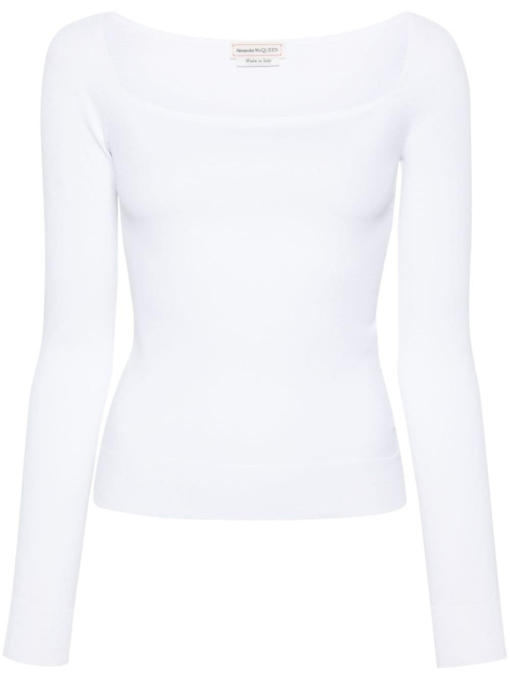square-neck fine-knit top Highlights - White - Fine knit - Square neck - Long sleeves - Ribbed cuffs and hem - Straight hem Made in Italy Composition Viscose 83%, Polyester 17% SIZE & FIT Model measurements Height 5 ft 11 in(1.8 m) Bust/Chest 34.25 in(87 cm) Hips 35.82 in(91 cm) Waist 24.8 in(63 cm) Measurement LENGTH 20.86 in(53 cm) WAIST 28.34 in(72 cm) FittingInformation Designed for a close fit throughout Made with a midweight knit, this piece offers some stretch This piece fits true to size – take your usual size Washing instructions Dry Clean Only