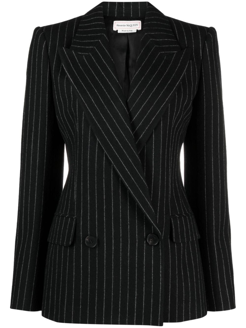 striped double-breasted blazer Following the brand's creative style, this double-breasted blazer from Alexander McQueen is enhanced with a vertical stripe pattern. Crafted from wool, this model features a fitted rear and is finished with wide peak lapels. Highlights - Black/white - Wool - Vertical stripe pattern - Wide peak lapels - Double-breasted button fastening - Long sleeves - Chest welt pocket - Two side flap pockets Made in Italy Composition Outer: Wool 100% Lining: Cupro 100% SIZE & FIT Model measurements Height 5 ft 11 in(1.8 m) Bust/Chest 33.07 in(84 cm) Hips 37.4 in(95 cm) Waist 25.19 in(64 cm) FittingInformation Designed for a slim fit that sits just away from the body offering a close yet comfortable fit The internal shoulder pads offer a structured shape Made from a midweight non-stretch fabric This piece fits true to size – take your usual size
