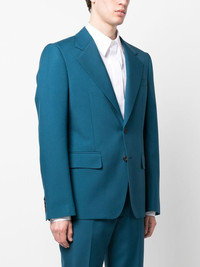 tailored single-breasted blazer teal blue wool blend tailored cut front button fastening notched lapels chest welt pocket two front flap pockets long sleeves buttoned cuffs central rear vent Made in Italy Composition Outer: Wool 50%, Polyester 50% Lining: Cupro 100%, Cotton 100%, Viscose 100% SIZE & FIT Model measurements Height 6 ft 2 in(1.87 m) Bust/Chest 35.82 in(91 cm) Hips 35.43 in(90 cm) Waist 27.95 in(71 cm) FittingInformation This piece fits true to size. We recommend you get your regular size Cut for a slim fit Made with a mid-weight non-stretch fabric Washing instructions Dry Clean Only