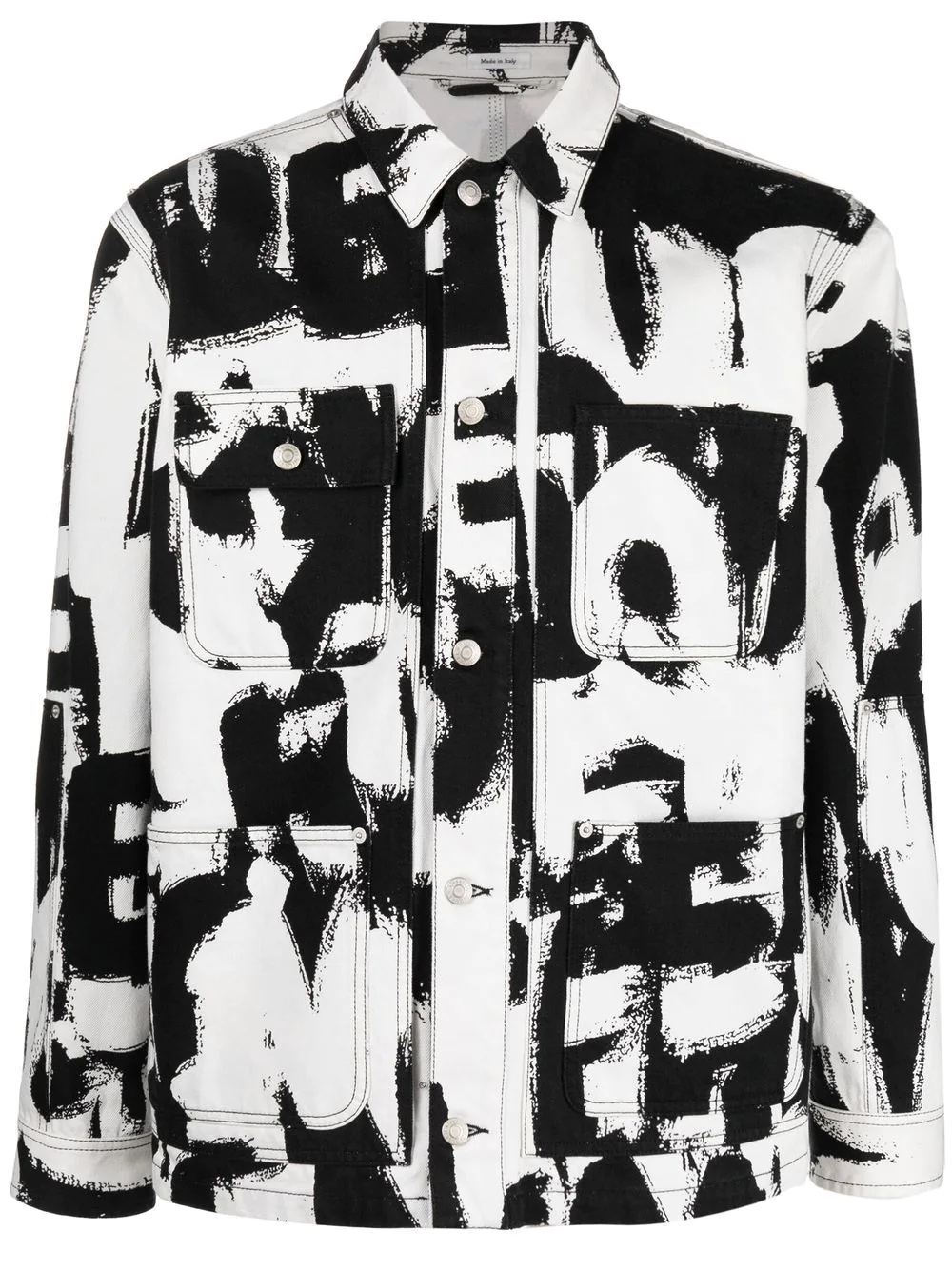 text print denim jacket black/white cotton text print classic collar front button fastening four front patch pockets long sleeves straight hem Made in Italy Composition Cotton 100%, Calf Leather 100% SIZE & FIT Model measurements Height 6 ft 0 in(1.84 m) Bust/Chest 35.82 in(91 cm) Hips 37 in(94 cm) Waist 28.34 in(72 cm) FittingInformation This piece fits true to size. We recommend you get your regular size Cut for a loose fit Made with a mid-weight non-stretch fabric Washing instructions Hand Wash