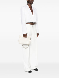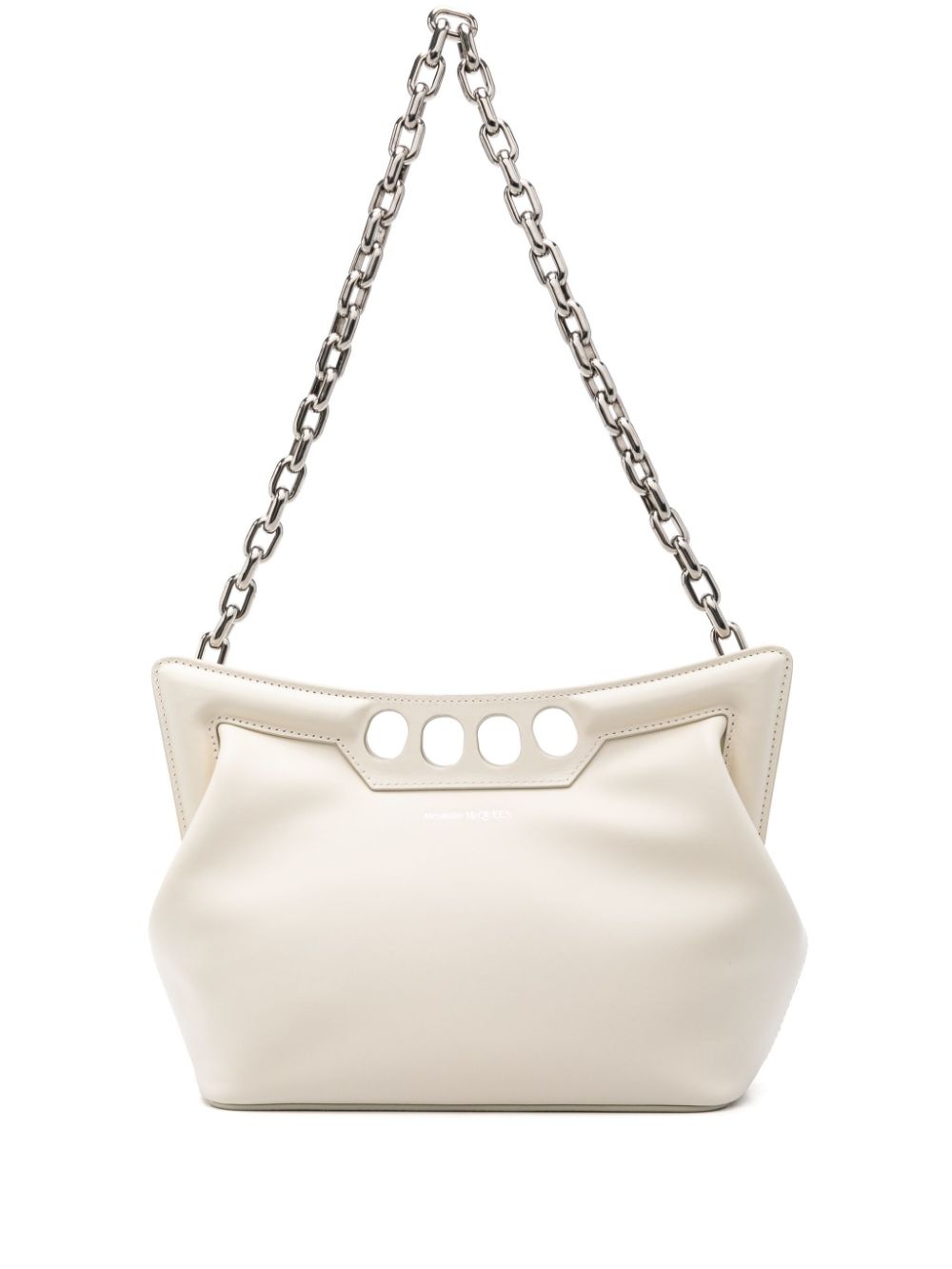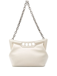 The Peak curved mini bag Highlights - Ivory white - Leather - Smooth grain - Curve-edge body - Detachable chain-link shoulder strap - Cut-out detailing - Debossed logo to the front - Main compartment - Internal flap pocket - Suede lining - Silver-tone hardware - Concealed magnetic fastening Made In Italy Composition Outer: Leather 100%, Brass 100% Lining: Suede 100% SIZE & FIT Model measurements Height 5 ft 10 in(1.77 m) Bust/Chest 32.28 in(82 cm) Hips 35.03 in(89 cm) Waist 25.19 in(64 cm) Measurement DEPTH 4.33 in(11 cm) HEIGHT 7.48 in(19 cm) STRAP 11.81 in(30 cm) WIDTH 11.02 in(28 cm)