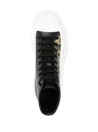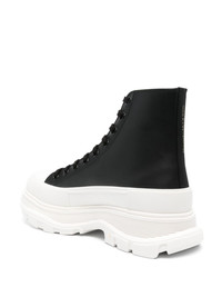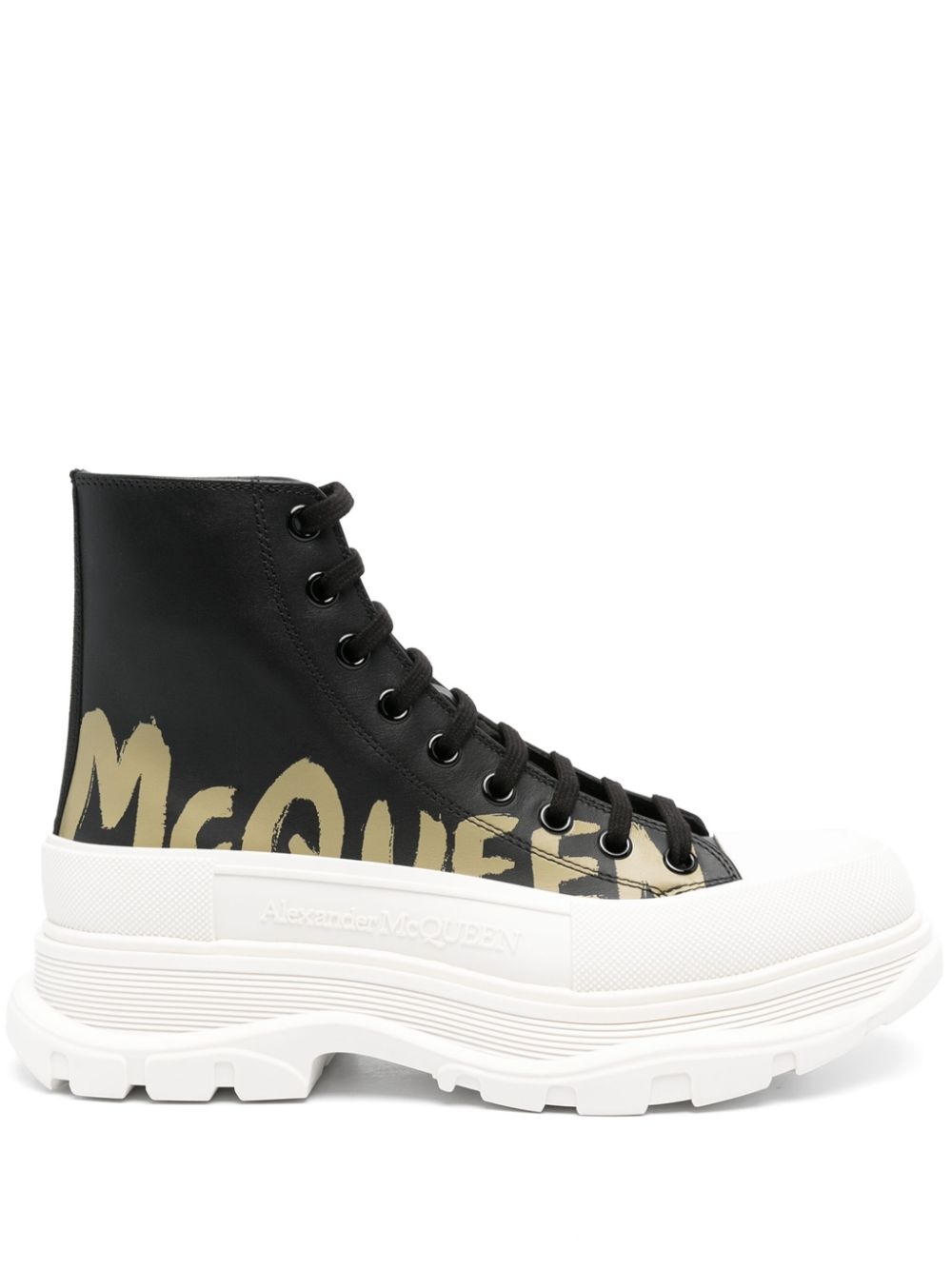 Tread Slick sneakers The rubber tread sole take the focus on these aptly named Tread Slick sneakers from Alexander McQueen. A high-top leather version of the iconic silhouette, this pair offers a contemporary design enhanced by the signature Graffiti logo print. Highlights - Black/white - Calf leather - Round toe - Rubber toecap - Embossed detail - Signature graffiti print to the side - Logo-print tongue - Branded heel counter - Ankle-length - Branded leather insole - Chunky rubber sole - Front lace-up fastening - To lessen the environmental impact and to reduce cotton consumption, alexander mcqueen will no longer be providing a dust bag with its sneakers. Made in Italy Composition Sole: Rubber 100% Lining: Calf Leather 100% Outer: Calf Leather 100% SIZE & FIT Measurement HEEL 1.96 in(5 cm) HEIGHT 5.9 in(15 cm) Sole height 1.18 in(3 cm)