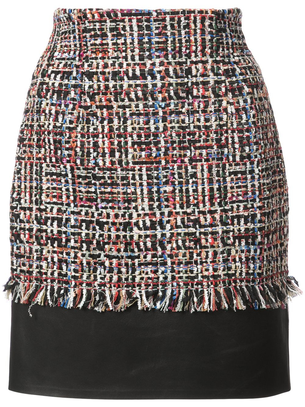 tweed mini skirt Current creative director Sarah Burton continues carrying through the late Alexander McQueen's legacy by maintaining his fascination with structure and exceptional tailoring. Made in Italy, this tweed skirt is the perfect rendition between the brand's beloved romantic and gothic style. It features a high waist, with a back zip fastening, a fitted silhouette and frayed tweed edges. Made in Italy Composition Lamb Skin 100%, Cotton 60%, Polyamide 29%, Viscose 25%, Wool 4%, Acrylic 1%, Polyester 1% SIZE & FIT Model measurements Height 5 ft 10 in(1.79 m) Bust/Chest 29.92 in(76 cm) Hips 33.07 in(84 cm) Waist 24.4 in(62 cm) Washing instructions Dry Clean Only