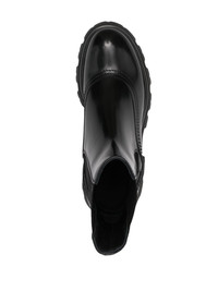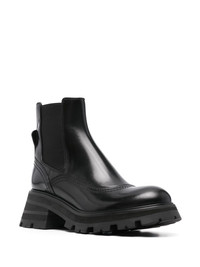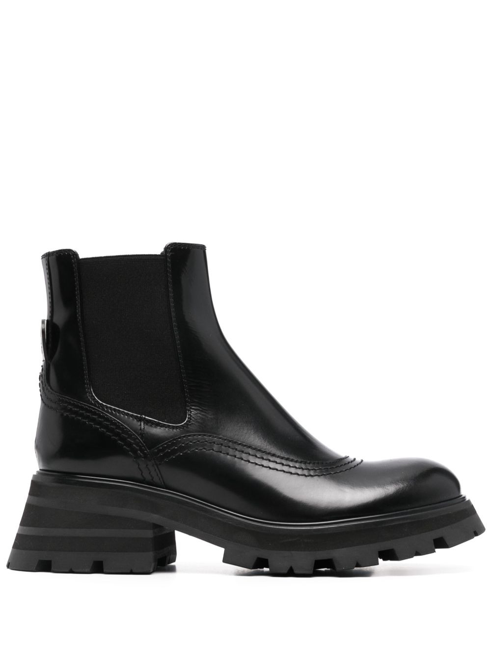 Wander Chelsea boots Evoking its signature oversized silhouette, Alexander McQueen has designed the Wander Chelsea boots with a chunky rubber that seamlessly contrasts with their refined soft calf leather construction. Made practical thanks to elasticated side panels and a pull-tab at the heel, they perfectly encapsulate the understated yet theatrical aesthetic of the brand. Highlights - Black - Leather - Panelled design - Signature seal logo detail - Pull-on style - Round toe - Elasticated side panels - Logo pull-tab at the heel - Ankle-length - Leather lining - Branded leather insole - Chunky rubber lug sole - This piece comes complete with a protective dust bag. Made in Italy Composition Leather 100% SIZE & FIT Model measurements Height 5 ft 10 in(1.78 m) Bust/Chest 33.07 in(84 cm) Hips 35.03 in(89 cm) Waist 25.19 in(64 cm) Measurement HEEL 2.36 in(6 cm) Sole height 1.18 in(3 cm) HEIGHT 5.31 in(13.5 cm) FittingInformation This piece fits true to size. We recommend you get your regular size This piece has a narrow fit. For those with a wide foot, get one size up