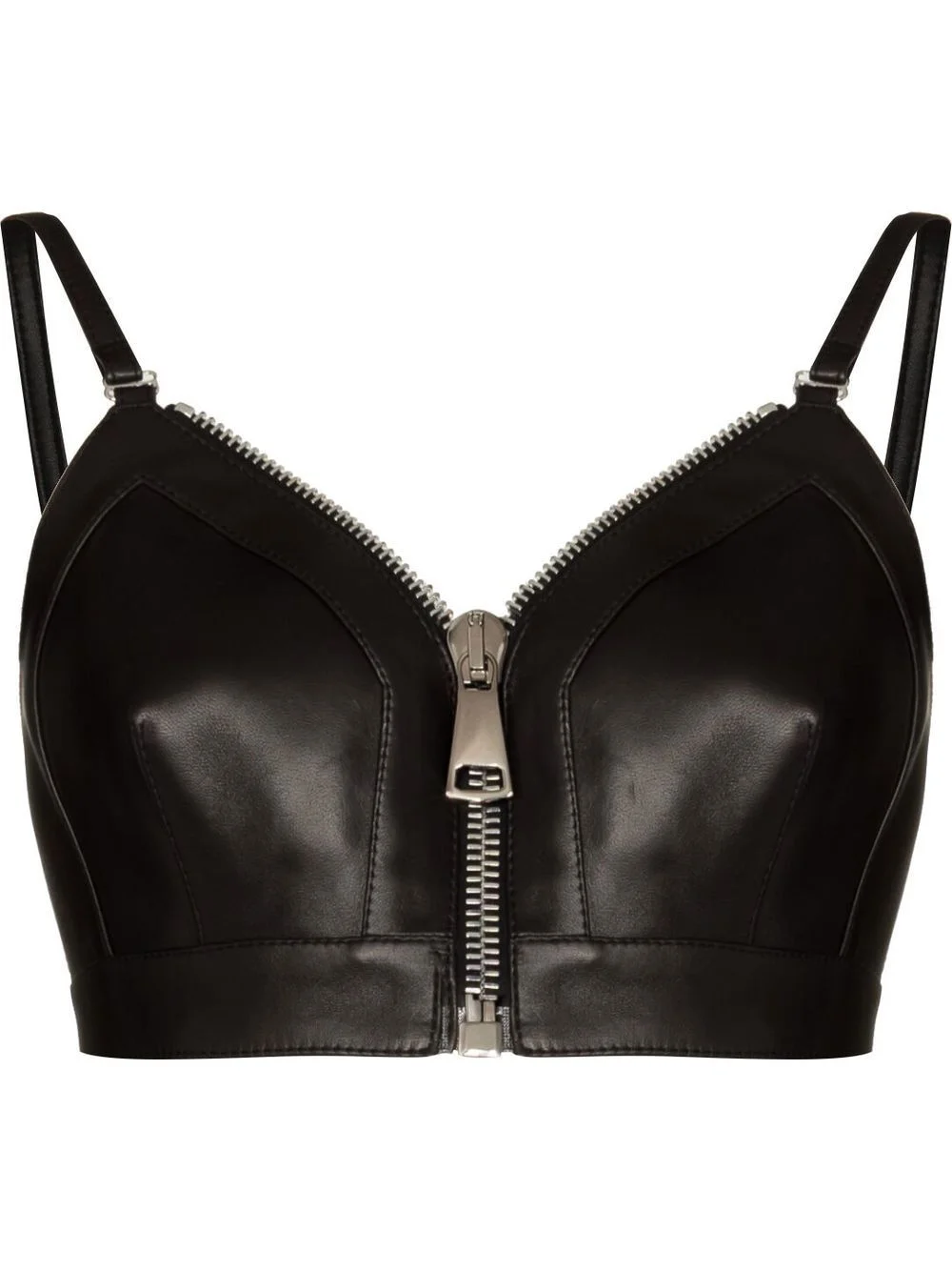 zip-front cropped leather top Showcasing its rebellious spirit, Alexander McQueen leans into the underwear as outerwear aesthetic with this top. In a bralette style, this top boasts a structured leather construction and bold zip fastening to the front. Made in Italy Composition Outer: Lamb Skin 100%