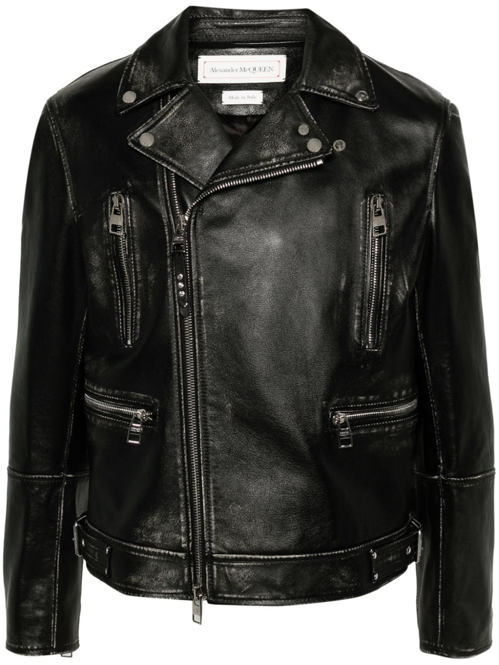 zipped leather biker jacket Highlights - Black - Leather - Silver-tone hardware - Decorative buckle detail - Notched collar - Off-centre front zip fastening - Long sleeves - Cuff zips - Front zip fastening pockets - Straight hem Made in Italy Composition Lining: Viscose 100%, Cotton 100%, Polyester 95%, Polyamide 5% Outer: Bos Taurus 100% SIZE & FIT Model measurements Height 6 ft 2 in(1.87 m) Bust/Chest 36.41 in(92.5 cm) Hips 35.43 in(90 cm) Waist 29.52 in(75 cm) FittingInformation Designed for a slim fit, offering a comfortable fit that sits just away from the body Firm leather offering little flexibility to maintain its durability and sturdiness This piece fits true to size – take your usual size Measurement CHEST 40.55 in(103 cm) SLEEVE LENGTH 25.19 in(64 cm) LENGTH 24.4 in(62 cm) WAIST 37.79 in(96 cm)