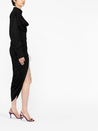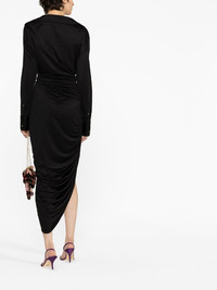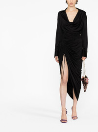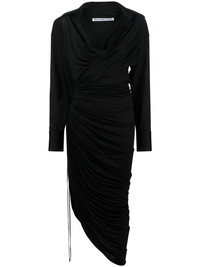 asymmetric V-neck dress Renowned for playing with classic silhouettes, Alexander Wang continues its adventure into asymmetry for SS23. Black draping shapes this dress, finished with a tie waist. Made in United States Composition Viscose 84%, Polyamide 16% SIZE & FIT Model measurements Height 5 ft 10 in(1.78 m) Bust/Chest 30.7 in(78 cm) Hips 34.64 in(88 cm) Waist 23.22 in(59 cm) Measurement SLEEVE LENGTH 22 in(55.9 cm) HIPS 30 in(76.2 cm) LENGTH 54.01 in(137.2 cm) WAIST 24.01 in(61 cm) BUST 32 in(81.3 cm) FittingInformation This piece fits true to size. We recommend you get your regular size Cut for a slim fit Made with a mid-weight fabric Washing instructions Dry Clean Only