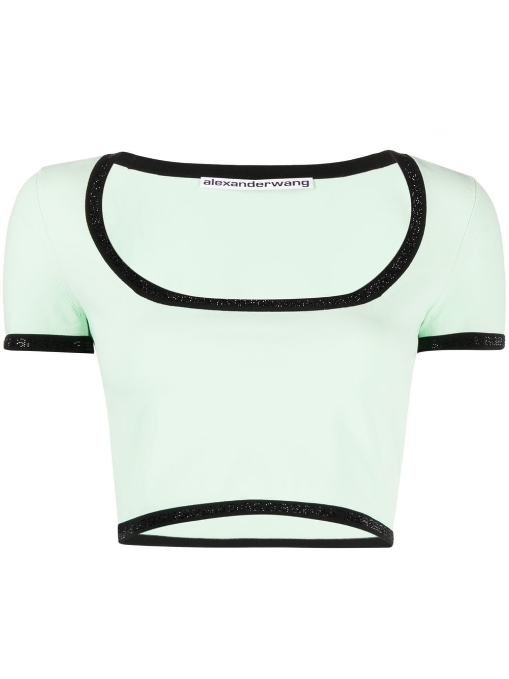 contrasting-border cropped T-shirt sage green cotton contrasting border scoop neck short sleeves cropped Imported Composition Cotton 100% SIZE & FIT Model measurements Height 5 ft 10 in(1.77 m) Bust/Chest 31.49 in(80 cm) Hips 35.43 in(90 cm) Waist 25.19 in(64 cm) FittingInformation This piece fits true to size. We recommend you get your regular size Cut for a close fit Made with a lightweight stretch fabric Washing instructions Hand Wash