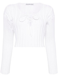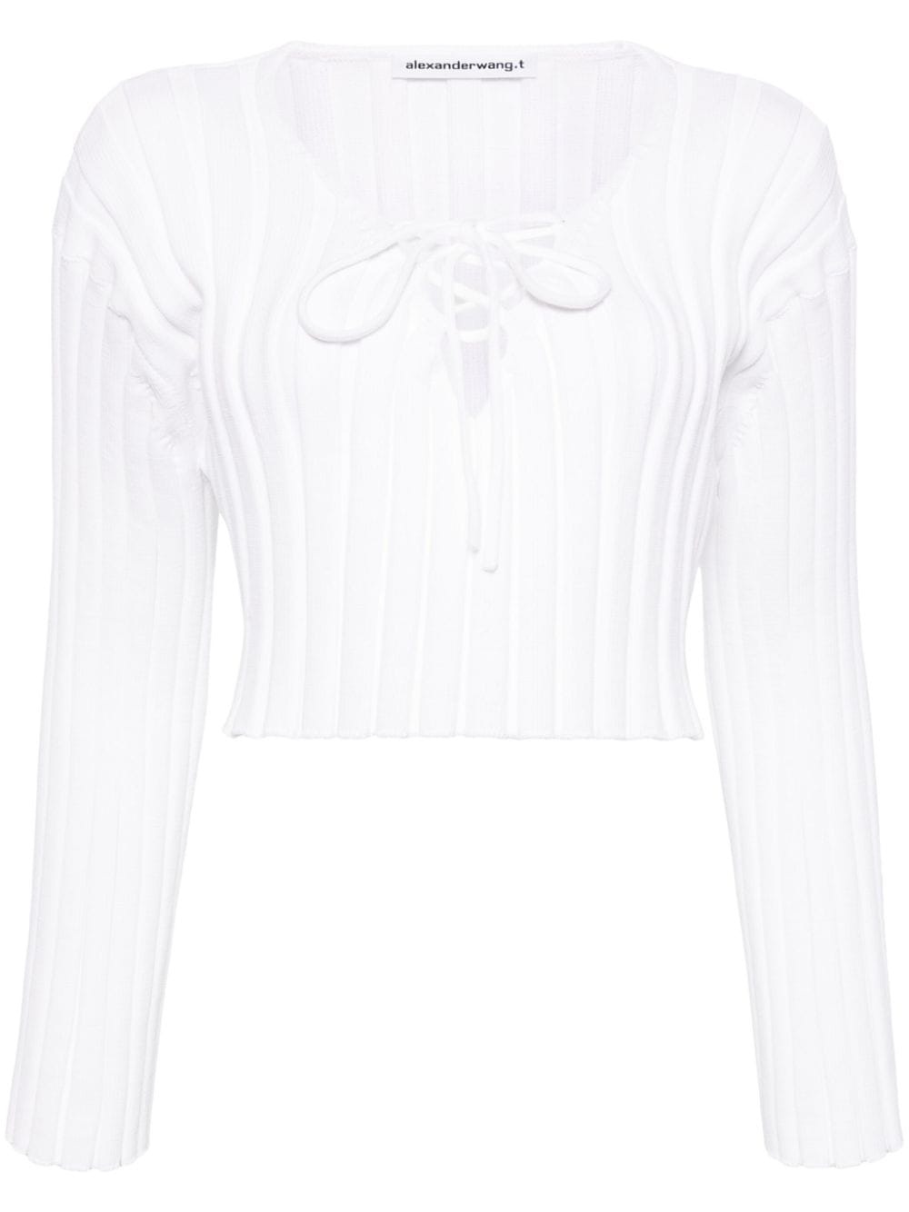 cropped ribbed sweater Highlights - White - Chunky ribbed knit - V-neck - Front lace-up fastening - Drop shoulder - Long sleeves - Cropped - Curved hem Imported Composition Polyamide 99%, Elastane 1% SIZE & FIT Model measurements Height 5 ft 10 in(1.78 m) Bust/Chest 32.67 in(83 cm) Hips 37 in(94 cm) Waist 25.59 in(65 cm) FittingInformation Designed for a relaxed fit, this piece allows for comfort and movement when worn Cropped in length Made with a midweight knit, this piece offers some stretch Measurement BUST 34.01 in(86.4 cm) LENGTH 15.98 in(40.6 cm) SLEEVE LENGTH 22.99 in(58.4 cm) Washing instructions Dry Clean Only