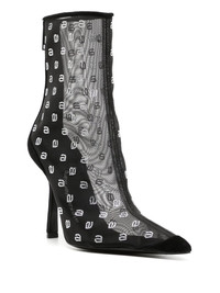 crystal-logo mesh boots black calf leather crystal embellishment mesh detailing ankle-length rear zip fastening pointed tip stiletto heel Imported Composition Outer: Polyester 100% Lining: Polyester 100% Sole: Calf Leather 100% SIZE & FIT Measurement CIRCUMFERENCE 9.44 in(24 cm) HEEL 3.93 in(10 cm) Sole height 0.19 in(0.5 cm)