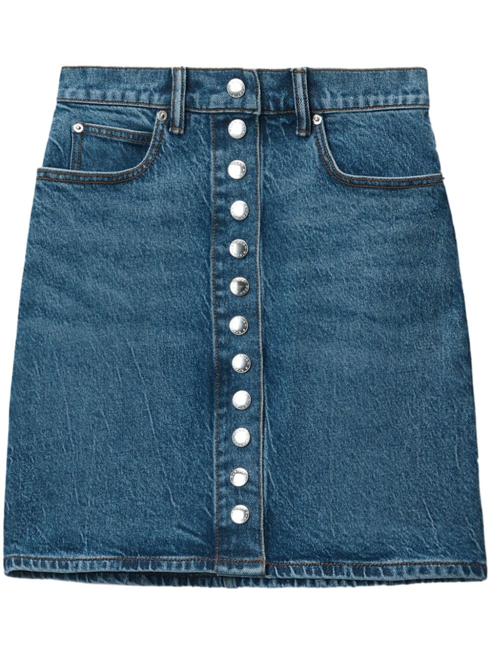 denim mini skirt Highlights - Blue - Stretch-cotton - Denim - Front button fastening - Logo patch to the rear - Belt loops - Classic five pockets - High waist - Straight hem - Thigh-length Made in Italy Composition Cotton 55%, Lyocell 44%, Elastane 1%