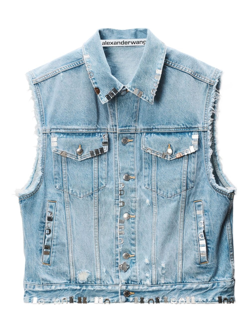 denim vest Highlights - Light blue - Button fastening - Metallic embellishments - Frayed edges Imported Composition Cotton 100% Washing instructions Read Manufacturer Guidelines
