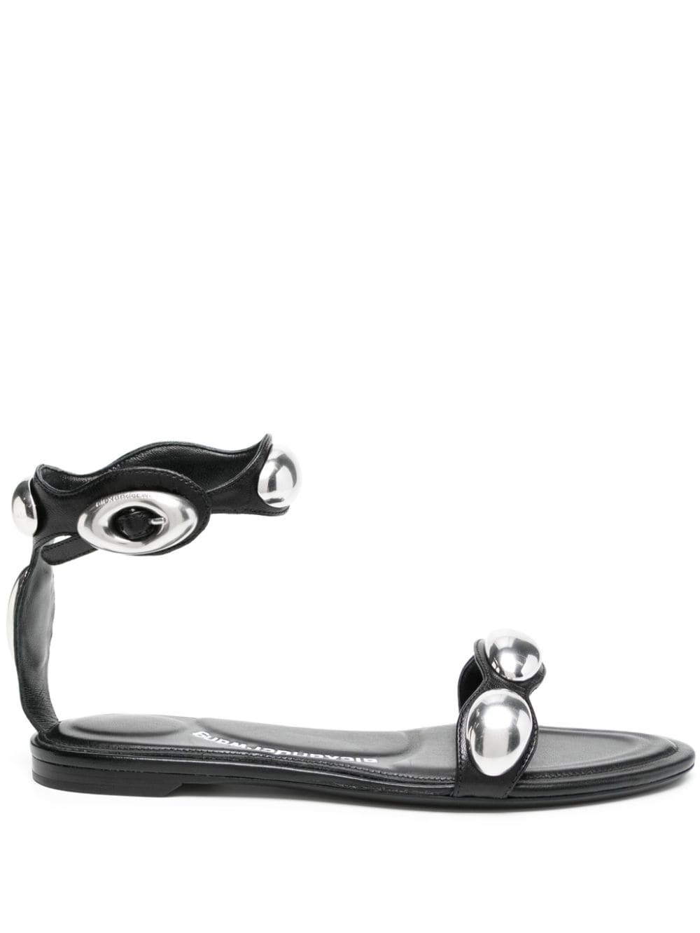 dome leather sandals These flat sandals by Alexander Wang stay true to the brand's contemporary style. The black leather construction is embellished with dome hardware on the straps, adding a touch of edginess to the design. Highlights - Black - Calf leather - Silver-tone hardware - Buckle-fastening ankle strap - Open toe - Branded insole - Flat sole Imported Composition Sole: Calf Leather 100% Lining: Lambskin 100% Outer: Goat Skin 100% SIZE & FIT Measurement HEEL 0.39 in(1 cm)