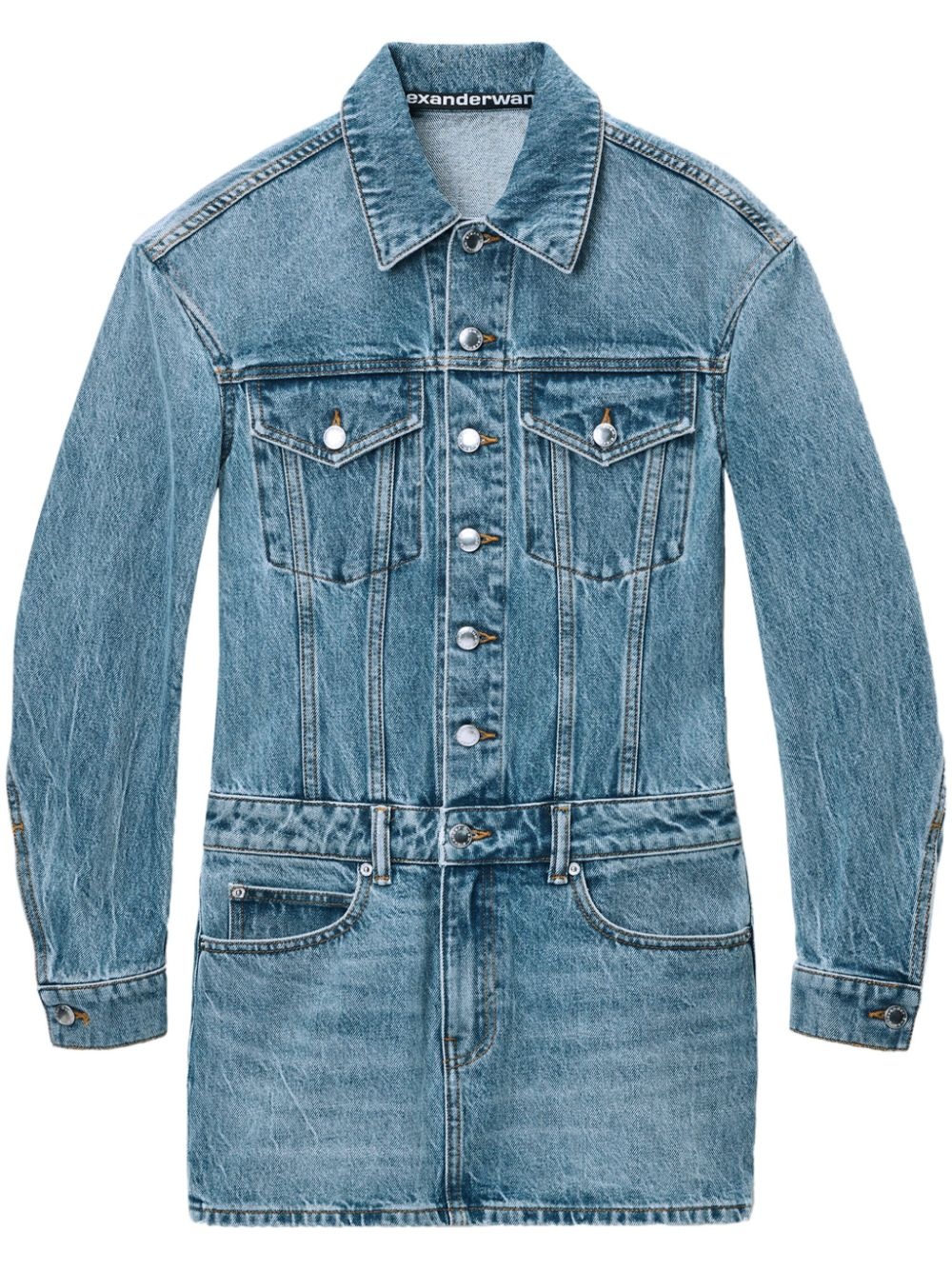 drop-shoulder mini dress Highlights - Light blue - Washed denim - Whiskering effect - Drop shoulder - Front button fastening - Contrast stitching - Spread collar - Long sleeves - Buttoned cuffs - Two chest flap pockets - Belt loops - Classic five pockets - Straight hem - Thigh-length Imported Composition Fabric 100%