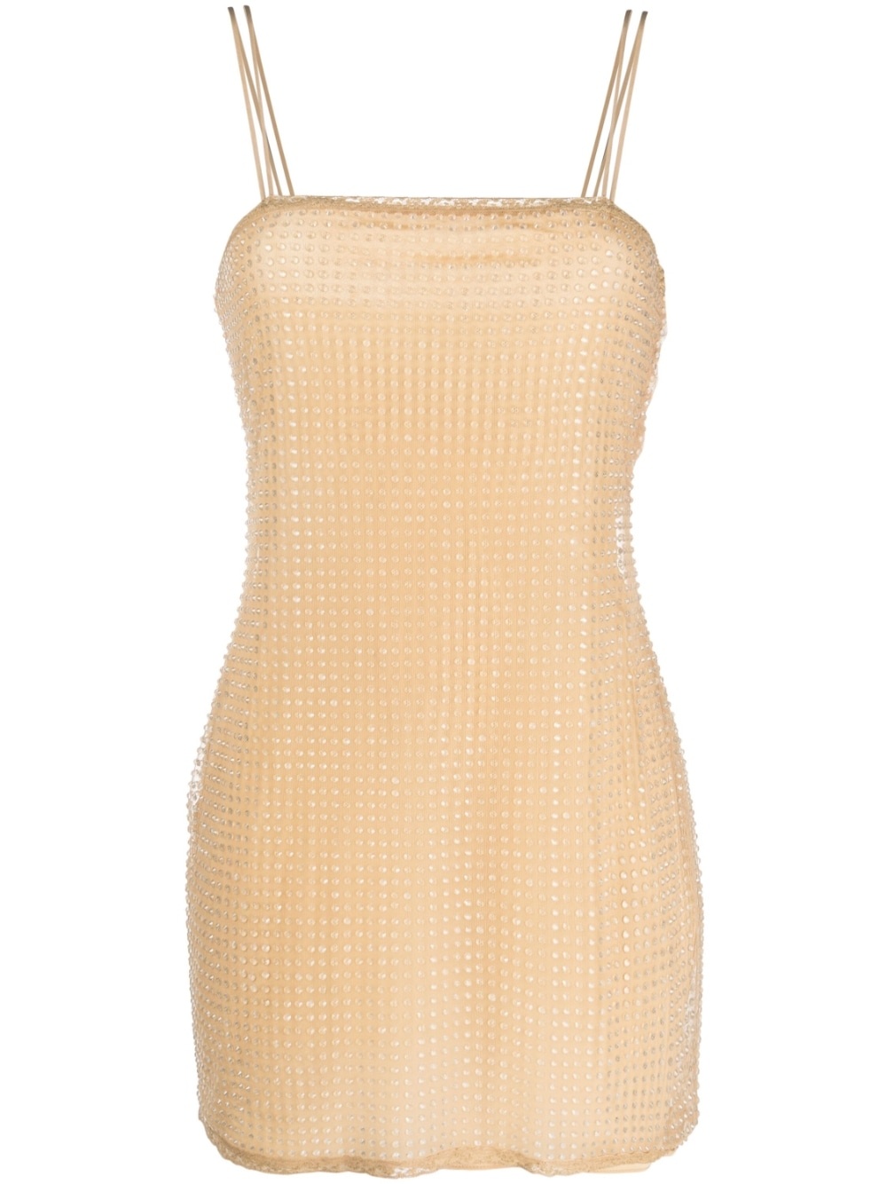 embellished mesh minidress This dress from Alexander Wang speaks to the brand’s penchant for glamorous detailing. Crafted from mesh to a mini-length silhouette, it’s embellished with glittering rhinestones. The silk lining is removable for custom styling. Highlights - Light beige - Mesh panelling - Rhinestone embellishment - Square neck - Spaghetti straps - Straight hem - Thigh-length Made in United States Composition Outer: Polyester 100% Lining: Silk 100% SIZE & FIT Model measurements Height 5 ft 10 in(1.77 m) Bust/Chest 32.67 in(83 cm) Hips 35.43 in(90 cm) Waist 23.62 in(60 cm) FittingInformation Designed for a slim fit that sits just away from the body offering a close yet comfortable fit The adjustable shoulder straps allow for a preferred fit when worn Made from a heavyweight non-stretch fabric Washing instructions Dry Clean Only