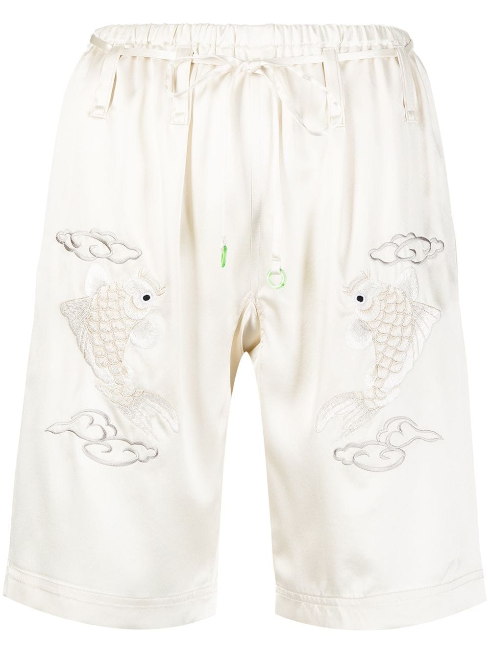 embroidered-design shorts ivory silk satin finish elasticated waistband embroidered design two side inset pockets Imported Composition Silk 100% SIZE & FIT Model measurements Height 5 ft 10 in(1.77 m) Bust/Chest 31.49 in(80 cm) Hips 34.64 in(88 cm) Waist 23.62 in(60 cm) FittingInformation This piece fits true to size. We recommend you get your regular size Designed for a loose fit with a close fit at the waist Made with a mid-weight non-stretch fabric Washing instructions Dry Clean Only
