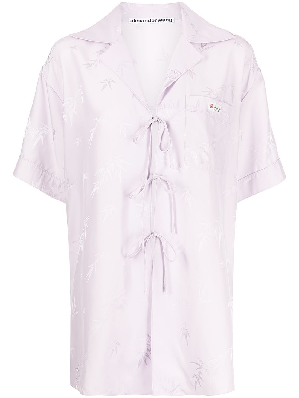 jacquard pajama-style shirt Alexander Wang's shirt nods to classic pajama styles. It's decorated with a jacquard pattern and tie fastenings through the front in place of buttons. Imported Composition Viscose 100% SIZE & FIT Model measurements Height 5 ft 10 in(1.77 m) Bust/Chest 33.85 in(86 cm) Hips 35.03 in(89 cm) Waist 24.01 in(61 cm) FittingInformation This piece fits true to size. We recommend you get your regular size Cut for a loose fit Made with a lightweight fabric