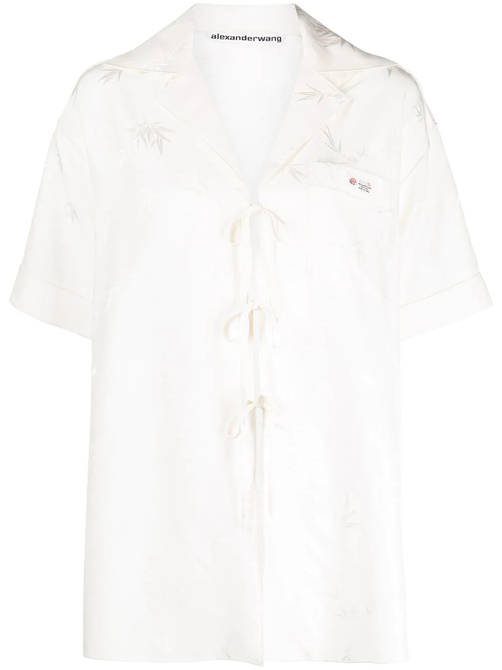 jacquard pajama-style shirt Alexander Wang's shirt nods to classic pajama styles. It's decorated with a jacquard pattern and tie fastenings through the front in place of buttons. Imported Composition Viscose 100% SIZE & FIT Model measurements Height 5 ft 10 in(1.77 m) Bust/Chest 33.85 in(86 cm) Hips 35.03 in(89 cm) Waist 24.01 in(61 cm) FittingInformation This piece fits true to size. We recommend you get your regular size Cut for a loose fit Made with a lightweight fabric