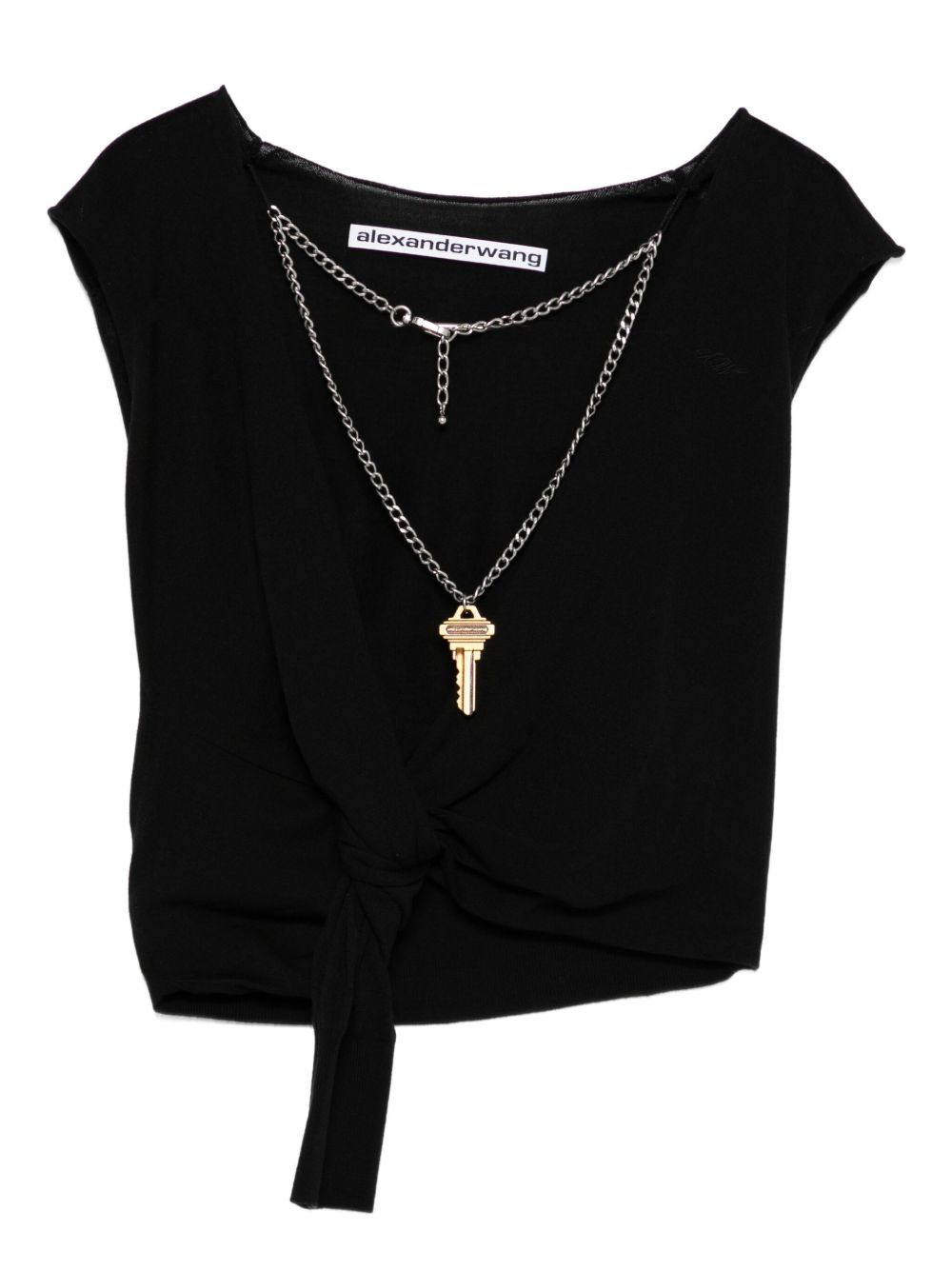 key-detail top Highlights - Black - Detachable key pendant - Knot front - Sleeveless - V-neck Imported Composition Wool 100% SIZE & FIT Model measurements Height 5 ft 9 in(1.75 m) Bust/Chest 32.67 in(83 cm) Hips 36.22 in(92 cm) Waist 24.8 in(63 cm) Washing instructions Dry Clean Only