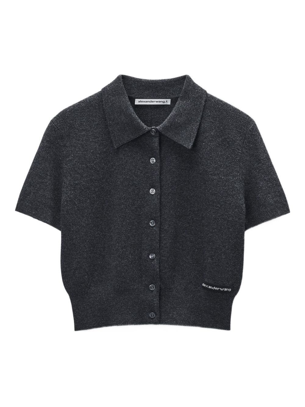 logo-patch polo-collar cardigan Highlights - Charcoal grey - Short sleeves - Polo collar - Button fastening - Cropped length - Knit fabric Imported Composition Wool 100% Washing instructions Read Manufacturer Guidelines