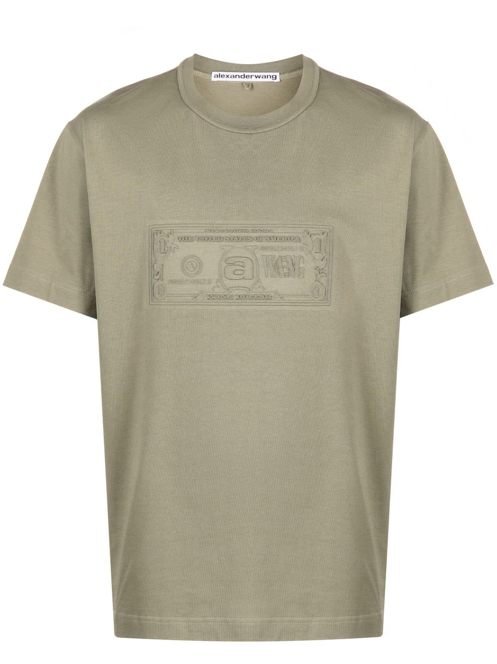 money-print short-sleeve T-shirt This Alexander Wang T-shirt combines streetwear style with playful details Featuring a debossed dollar bill motif and contemporary green shade add a modern feel to a classic short-sleeve silhouette. Highlights - Green - Cotton - Debossed detailing - Crew neck - Short sleeves - When buying this unisex item, keep in mind that it is graded in standard men's sizing. Imported Composition Cotton 100% SIZE & FIT Model measurements Height 6 ft 2 in(1.89 m) Bust/Chest 35.82 in(91 cm) Hips 37.4 in(95 cm) Waist 33.07 in(84 cm) FittingInformation This unisex piece is designed for a loose fit whether you usually select women's or men's sizes Made from a midweight non-stretch fabric, this piece offers minimal elasticity when worn
