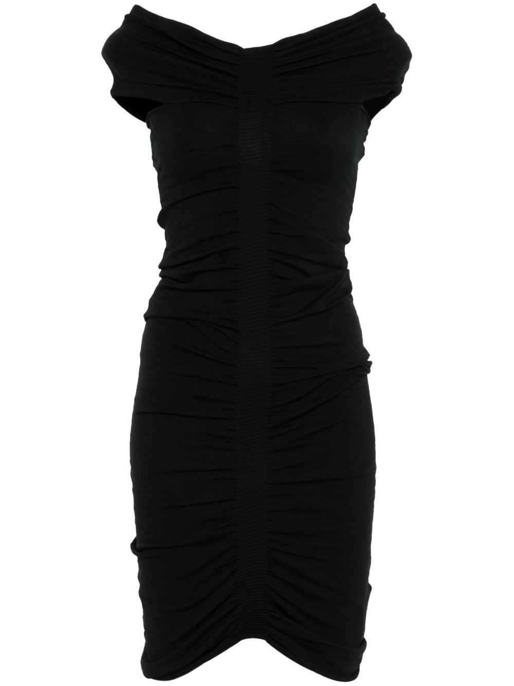off-shoulder mini dress Highlights - Black - Ruched detailing - Asymmetric hem - Rolled trim Imported Composition Cupro 48%, Polyester 30%, Polyamide 19%, Elastane 3% SIZE & FIT Model measurements Height 5 ft 10 in(1.78 m) Bust/Chest 33.85 in(86 cm) Hips 36.61 in(93 cm) Waist 26.77 in(68 cm) FittingInformation Designed for a close fit throughout Made from a midweight stretch fabric, this piece offers elasticity and flexibility when worn