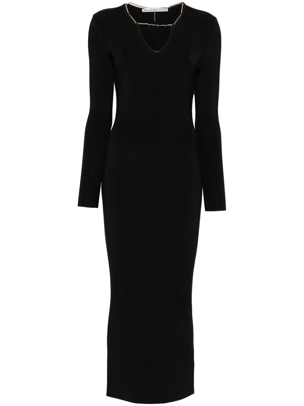plate chain-detailed maxi dress Highlights - Black - V-neck - Long sleeves Imported Composition Viscose 89%, Polyamide 9%, Elastane 2% SIZE & FIT Model measurements Height 5 ft 10 in(1.78 m) Bust/Chest 33.46 in(85 cm) Hips 36.22 in(92 cm) Waist 23.22 in(59 cm) FittingInformation Designed for a close fit throughout Made from a midweight stretch fabric, this piece offers elasticity and flexibility when worn