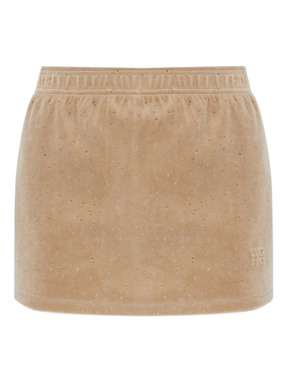 rhinestone-embellished embossed-logo mini skirt Highlights - Beige - Rhinestone embellishment - Logo detail - Elasticated waistband - Tonal stitching Imported Composition Cotton 73%, Polyester 27% Washing instructions Read Manufacturer Guidelines